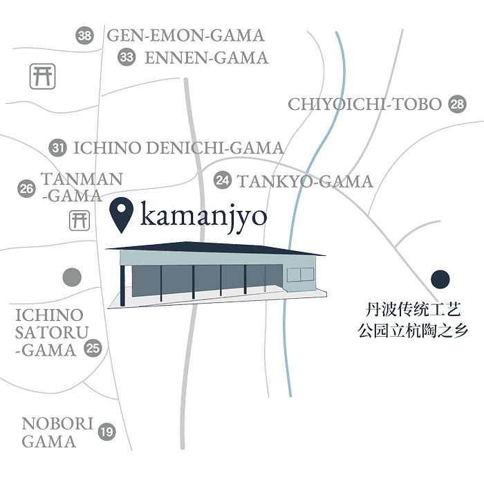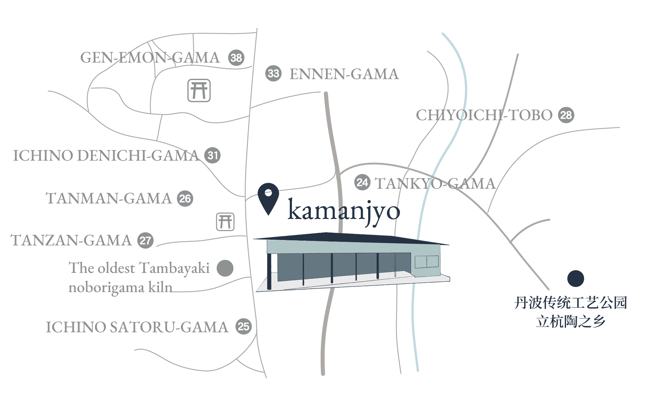 Kamanjyo 名称的由来——“kamanjyo”这一名称源自当地的方言。在方言中,上方被称为“uenjyo”,下方被称为“shitanjyo”。由此引申出“窑所在之处=kamanjyo”的想法,并在组合成员的提议下正式命名。在 kamanjyo 正前方,矗立着立杭地区的象征——“最古的登窑”。