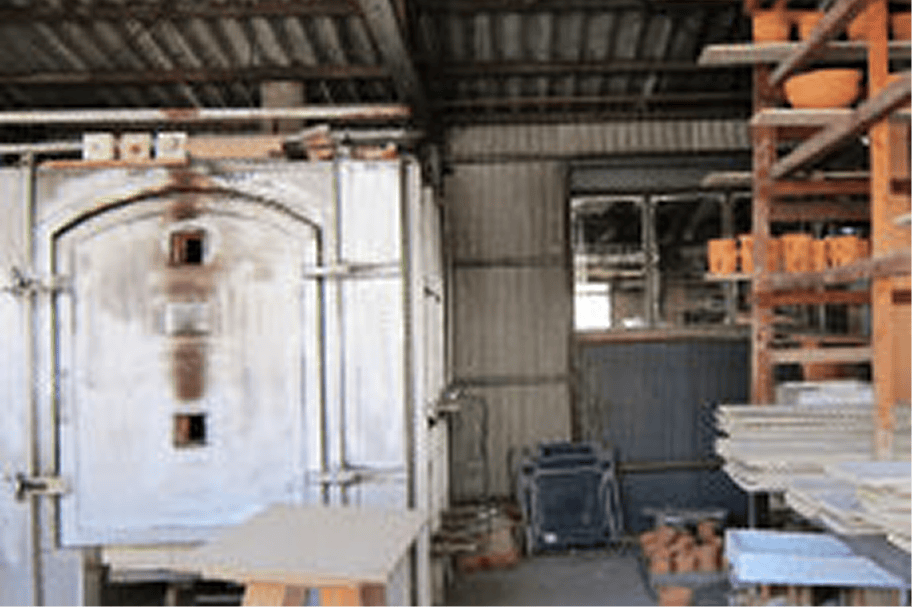 Today, the most widely used method is firing with electric kilns. From the Showa to the Heisei period, large gas kilns capable of short firing times and mass production of large items such as flower vases spread rapidly. In recent years, however, as production has shifted toward everyday tableware, more kilns have introduced compact electric kilns with electronically controlled temperature management to accommodate small-lot, short-delivery production.