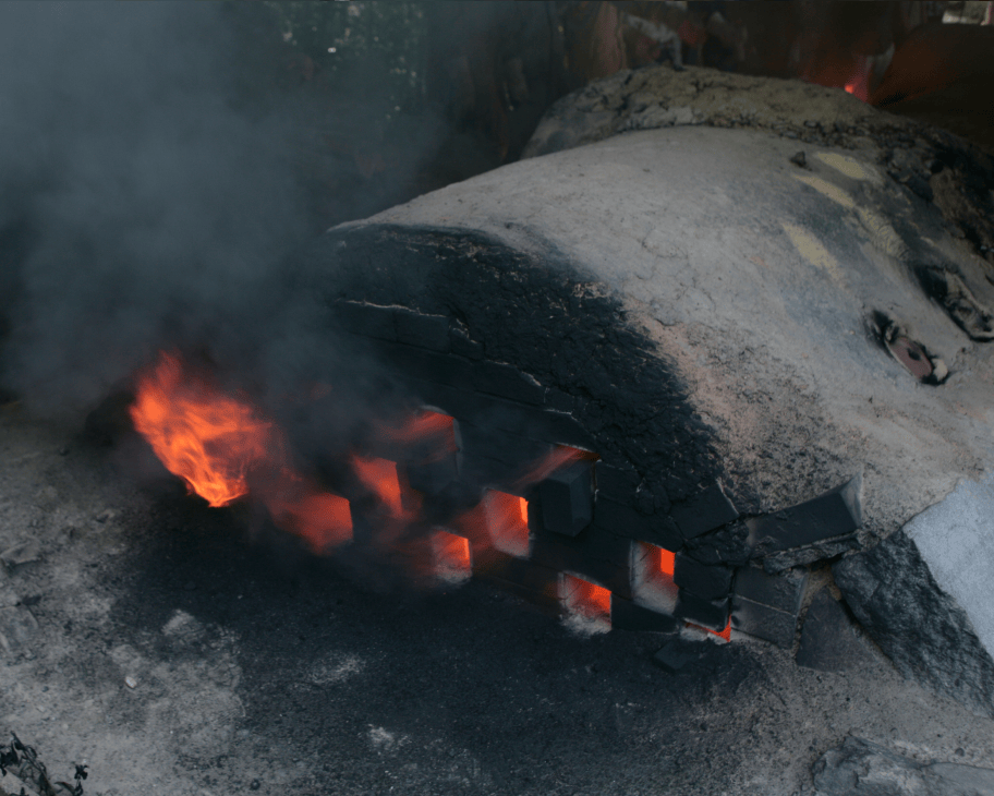 Although it varies depending on kiln size, after 30–40 hours of preheating, flames rise upward and the main firing begins. Split pine wood is continuously fed through openings on both sides of each chamber. The temperature inside the kiln reaches approximately 1,300°C.