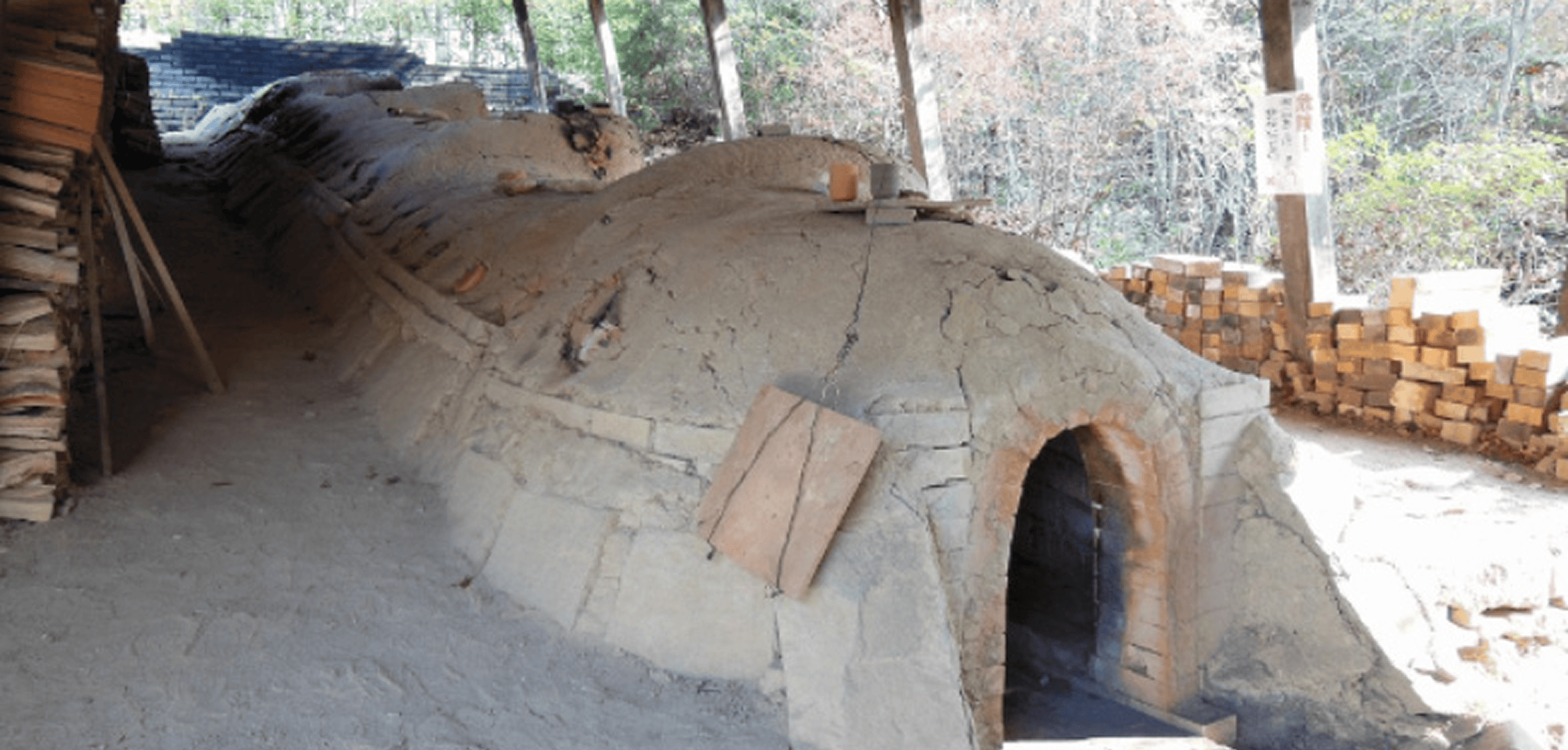 An anagama kiln has an extremely simple structure: a trench is dug into a sloping mountainside, reinforced with stone and clay, covered with a roof, and then sealed with earth. Firing in an anagama kiln required a considerable number of days (around two weeks), and because it had only a single firing chamber, the amount that could be fired at one time was limited.