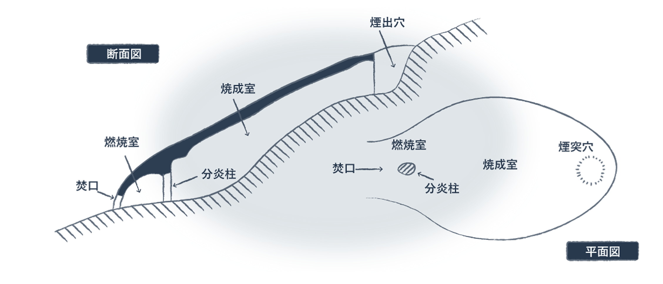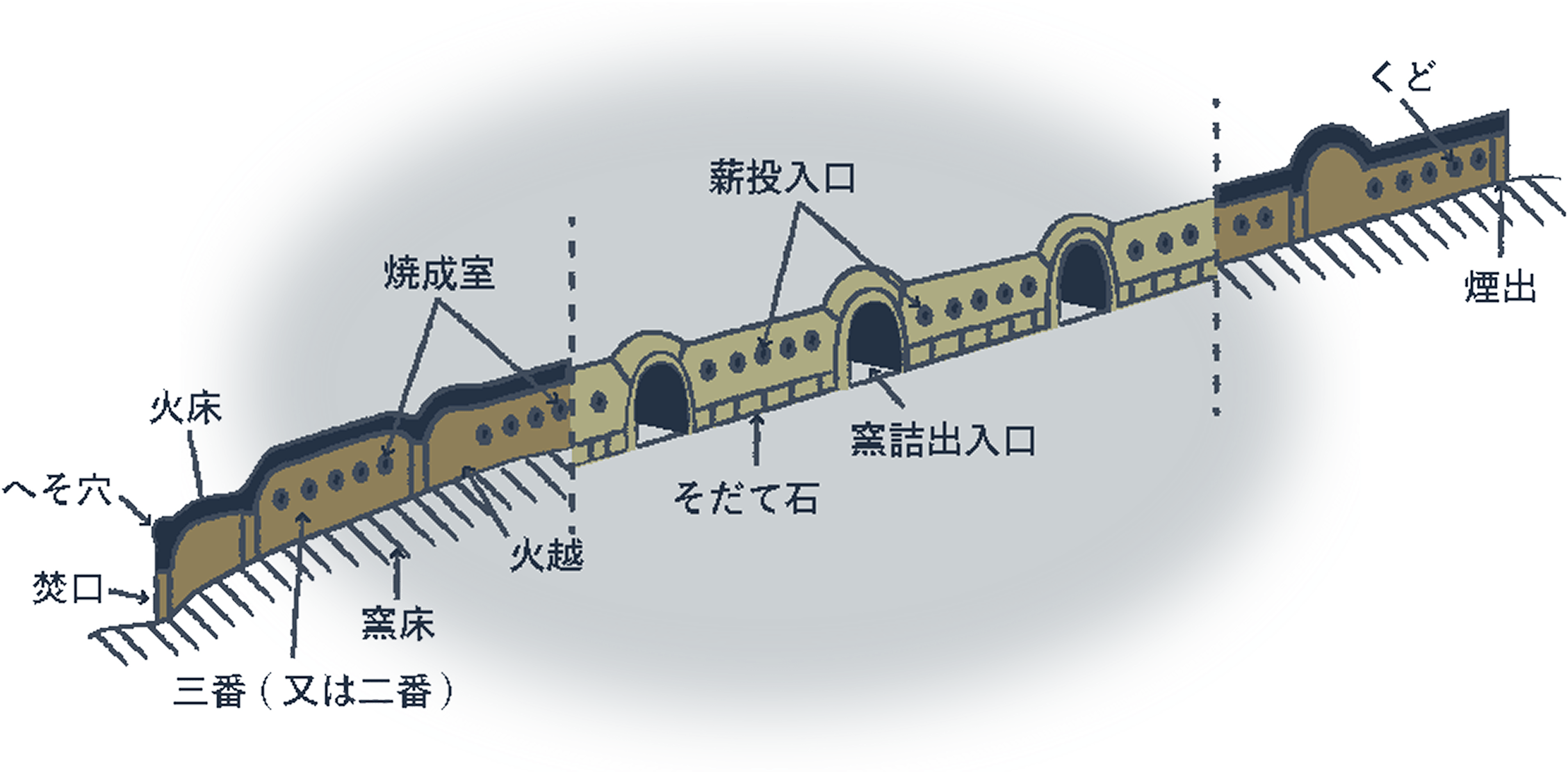 The kiln consists of a firebox followed by a series of firing chambers. Except for the first chamber connected to the firebox and the frontmost chamber called the “kudo,” the intermediate chambers are almost equal in length.