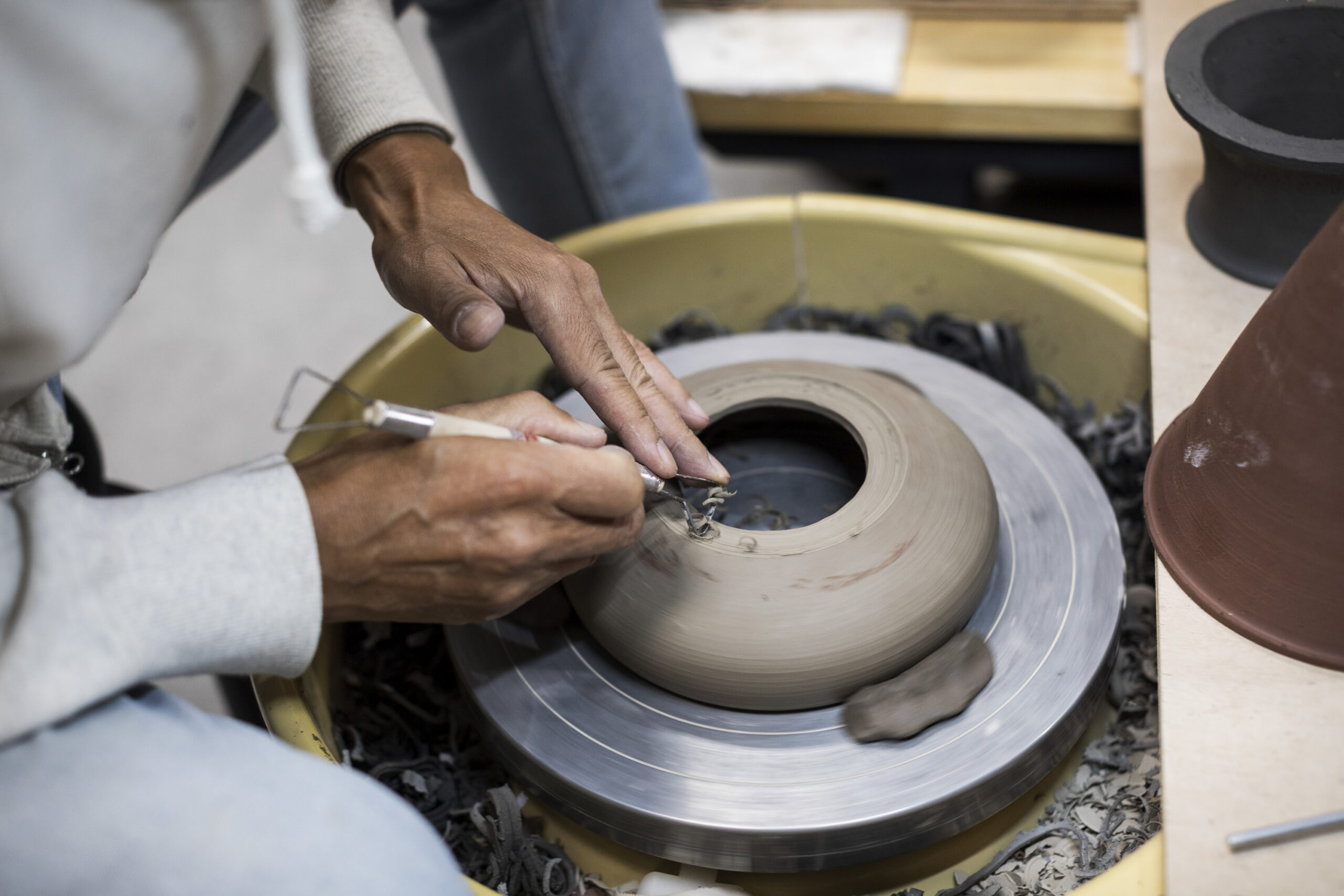 In fact, Hiroo spent 42 years working at the forefront of television set design. Today, he divides his time between two bases: on weekdays he works in his studio in Tachikui, and on weekends he travels back and forth to Suita in Osaka, where his family lives. Moving from television art direction to ceramics, he speaks quietly about the clear difference between these two forms of “making.”