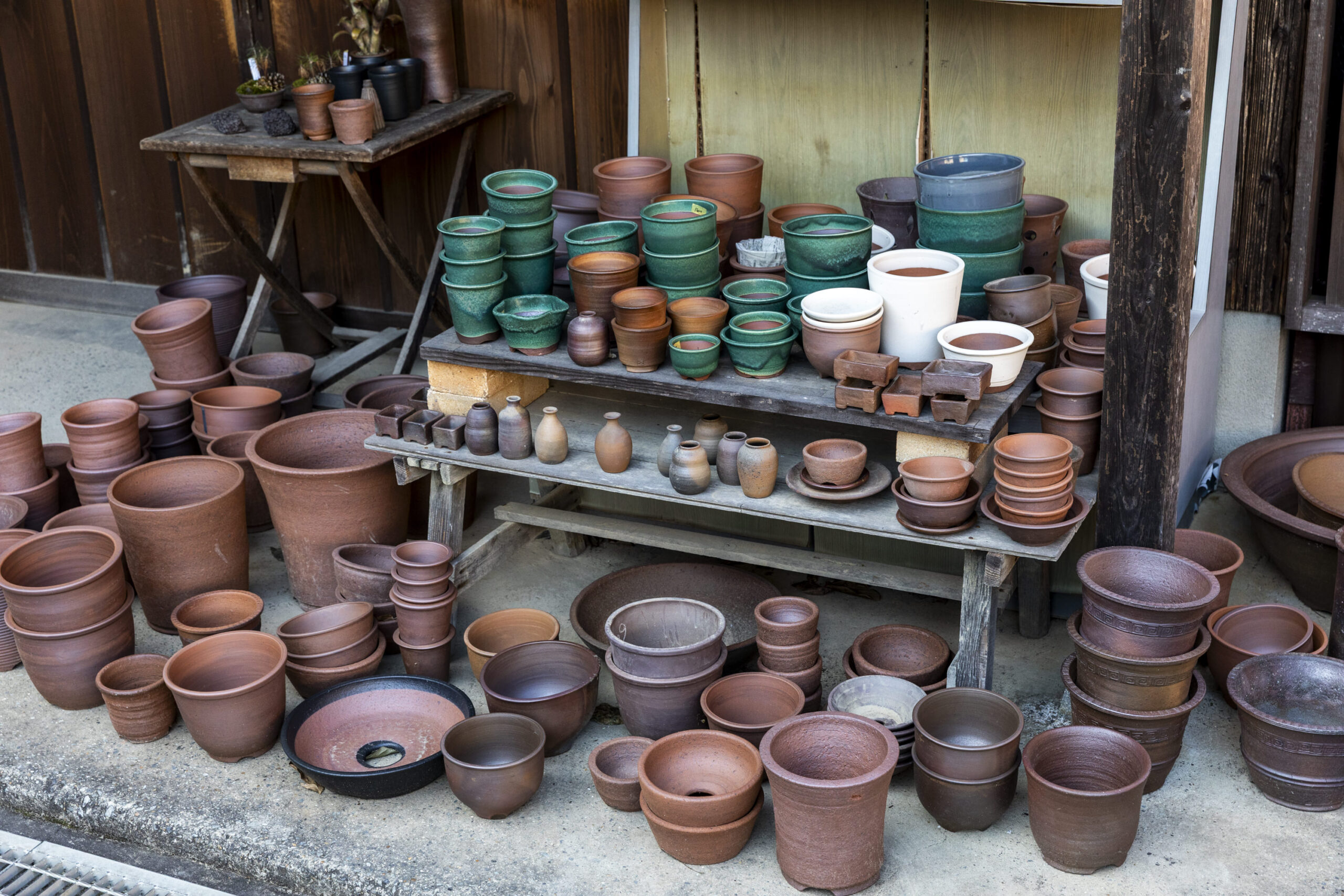 Each planter is formed one by one on the wheel using Tamba clay. They come in a wide range of sizes, all with a simple, unadorned presence. Trusted and beloved by enthusiasts, these pots are known as “Denichi-bachi.” With their thick rims, they are easy to hold and carry a strong yet understated presence.
