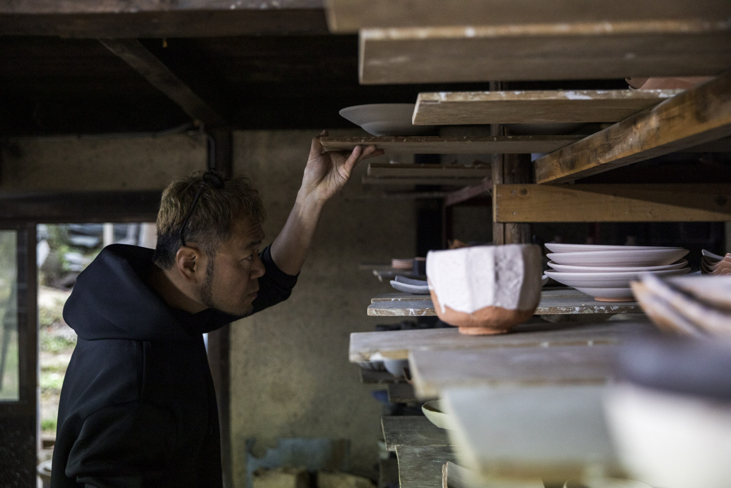 After work, he prepares simple dishes himself and enjoys an evening drink—beer first, then sake. Yet he rarely uses his own potters during these moments.