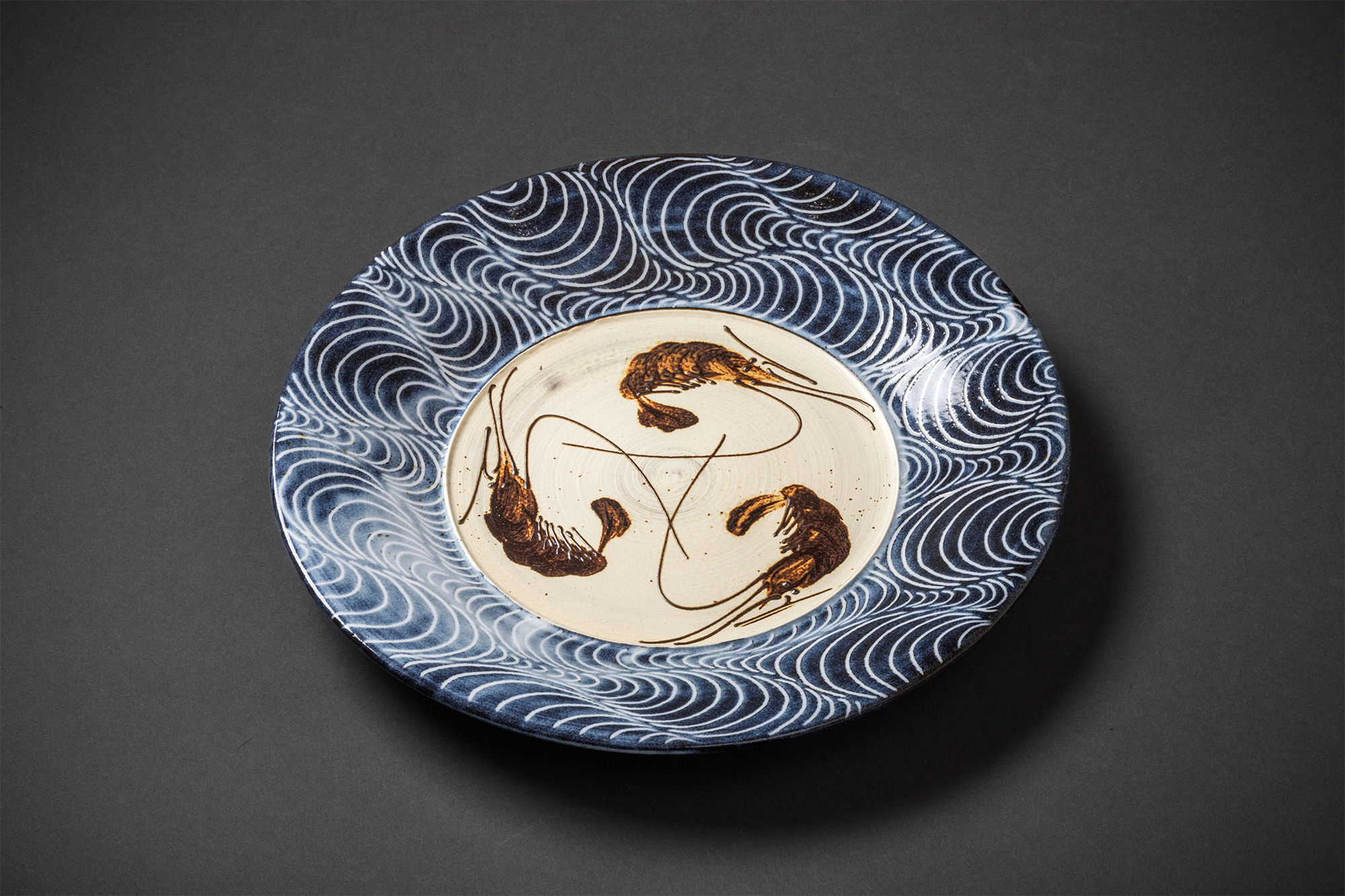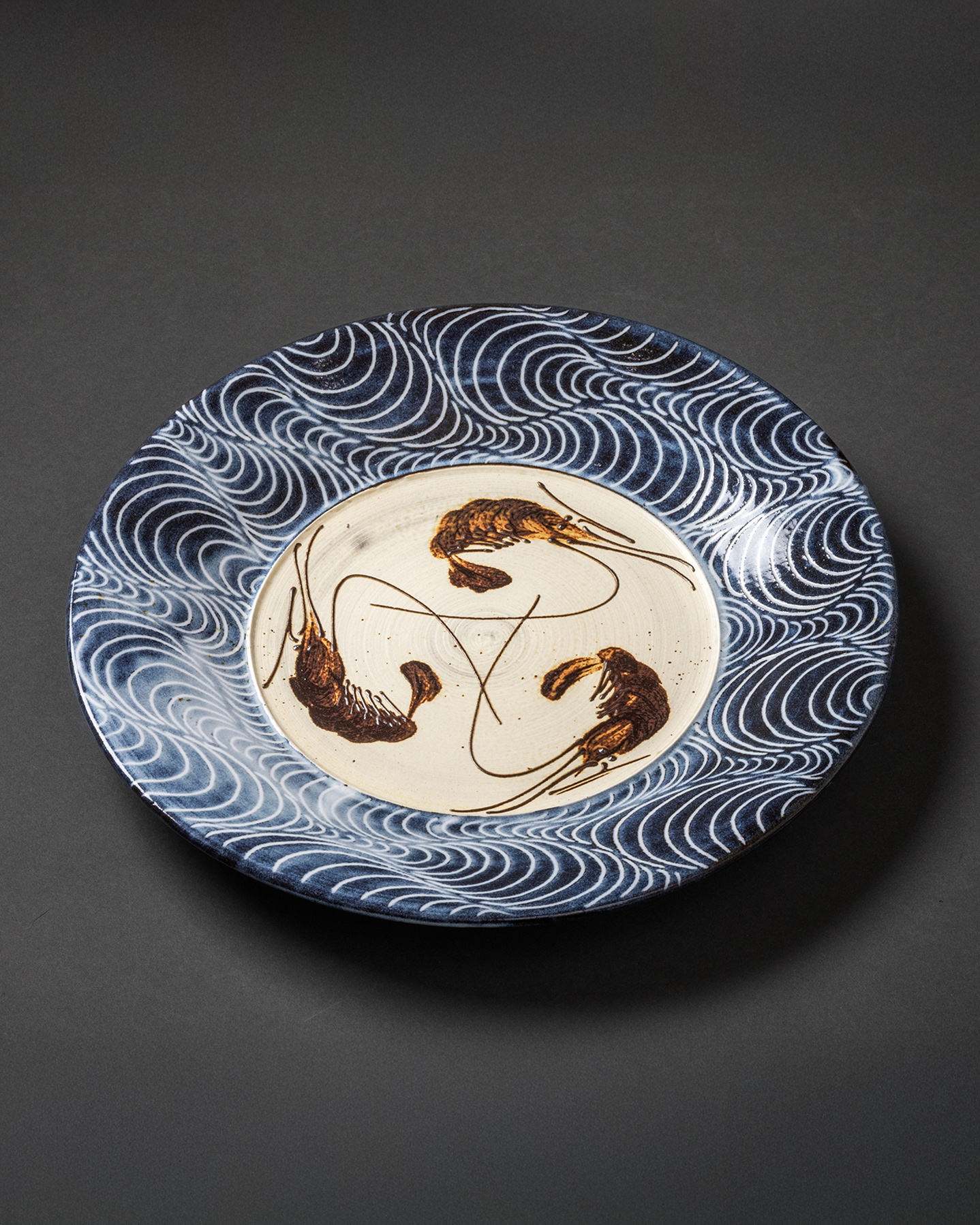 Among his works, the shrimp motif drawn in the traditional itchin (slip-trailing) technique has become a signature of TANKYO-GAMA. Once commonly applied to large jars and sake flasks as an auspicious design, Shimizu has reimagined it for modern teacups and small plates. Extruded in fine lines of clay, the shrimp seem almost ready to leap from the surface of the form.