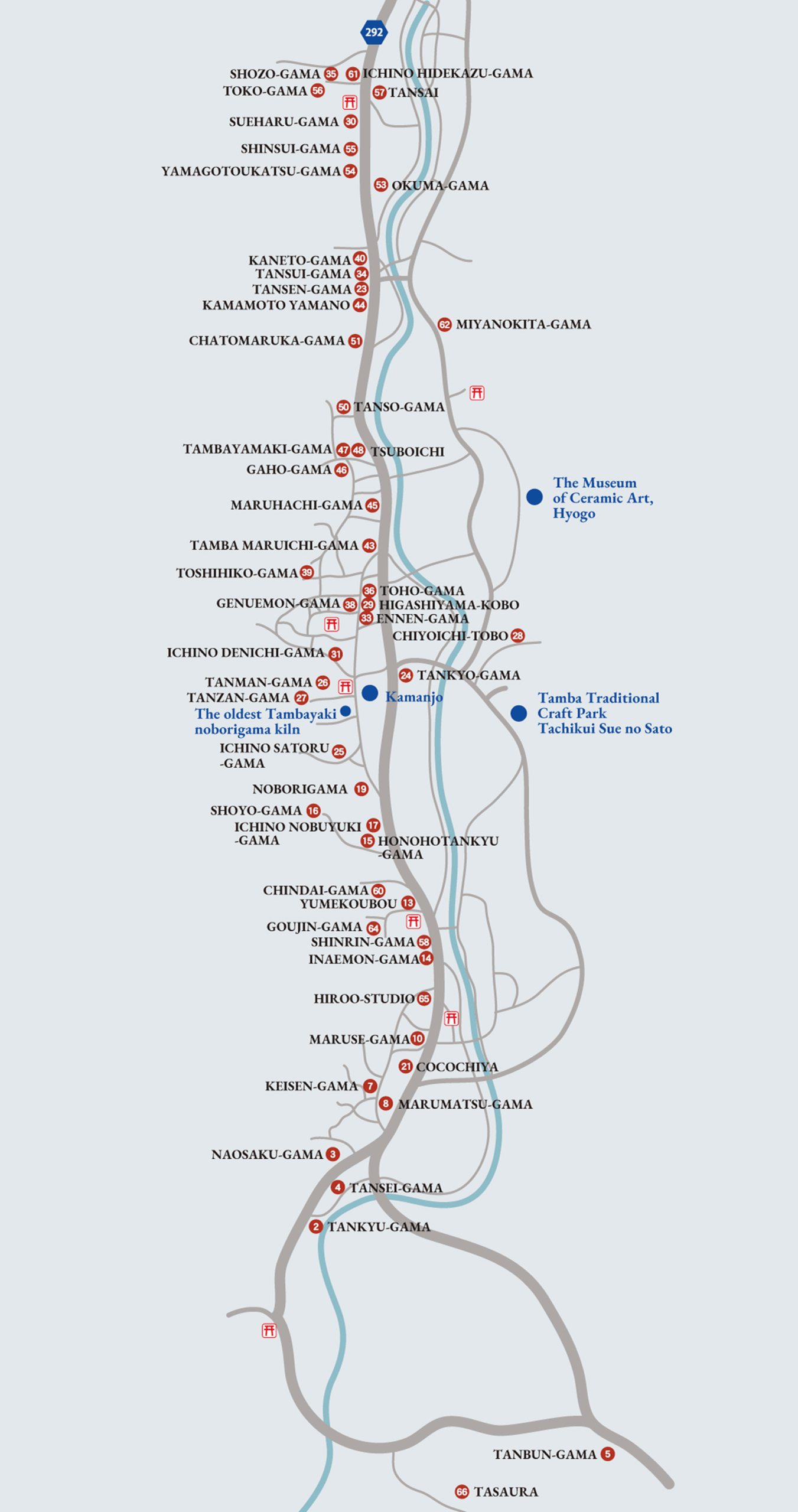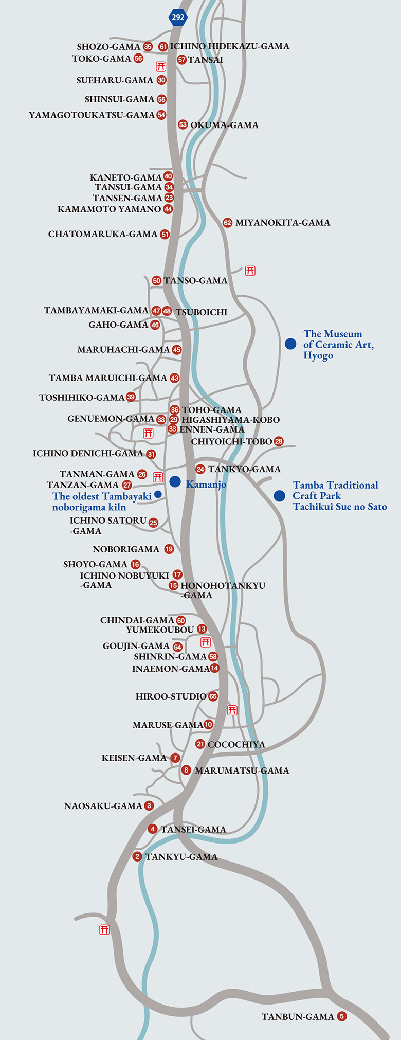 Take a Shinki Bus bound for ‘Shimizu’ (清水) or ‘Hyōgo-tōgei-bijutsukan’ (Hyogo Museum of Ceramic Art 兵庫陶芸美術館) for 10 minutes and get off at the ‘Sue-no-sato-mae’ (陶の郷前) bus stop. Alternatively, get off at ‘Tachikui-kokaido-mae’ (立杭公会堂前) and walk 5 minutes.